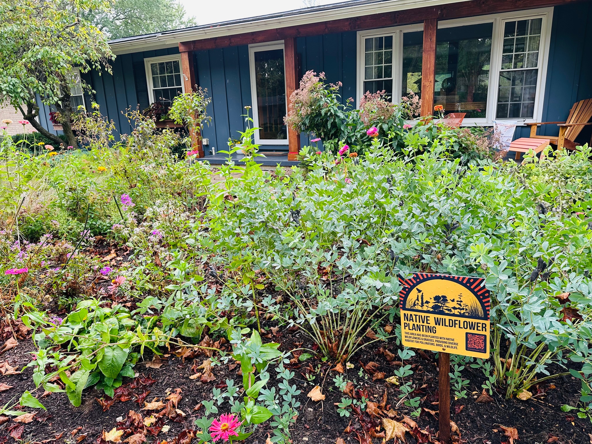 SEPTEMBER / Jan McWethy yard – We bought our house three years ago. Two things happened almost simultaneously last spring to radically change our front yard. I read Doug Tallamy’s Nature’s Best Hope, and we needed foundation work done on our basement’s front wall. Once the basement wall was shored up and the yard was all mud, I informed our contractor that I wanted to more than double the size of the former front bed and have all native plants installed. He scratched his head but came through. A delivery of 88 one-gallon plants arrived, most of them native. My other main project has been working to eliminate the many beds of ditch lilies on the side and back of the house and replace them with native plantings.