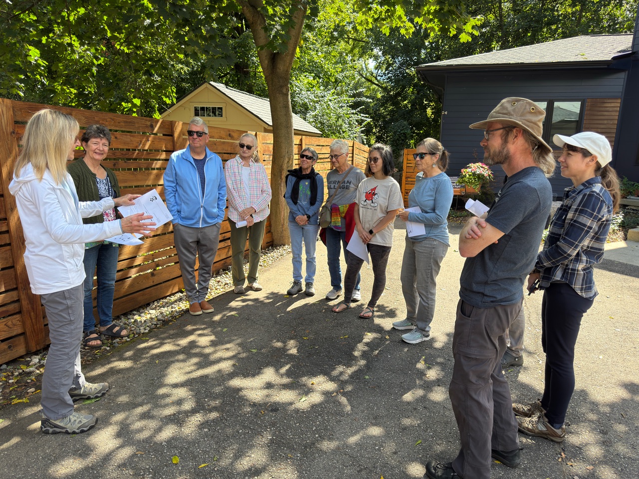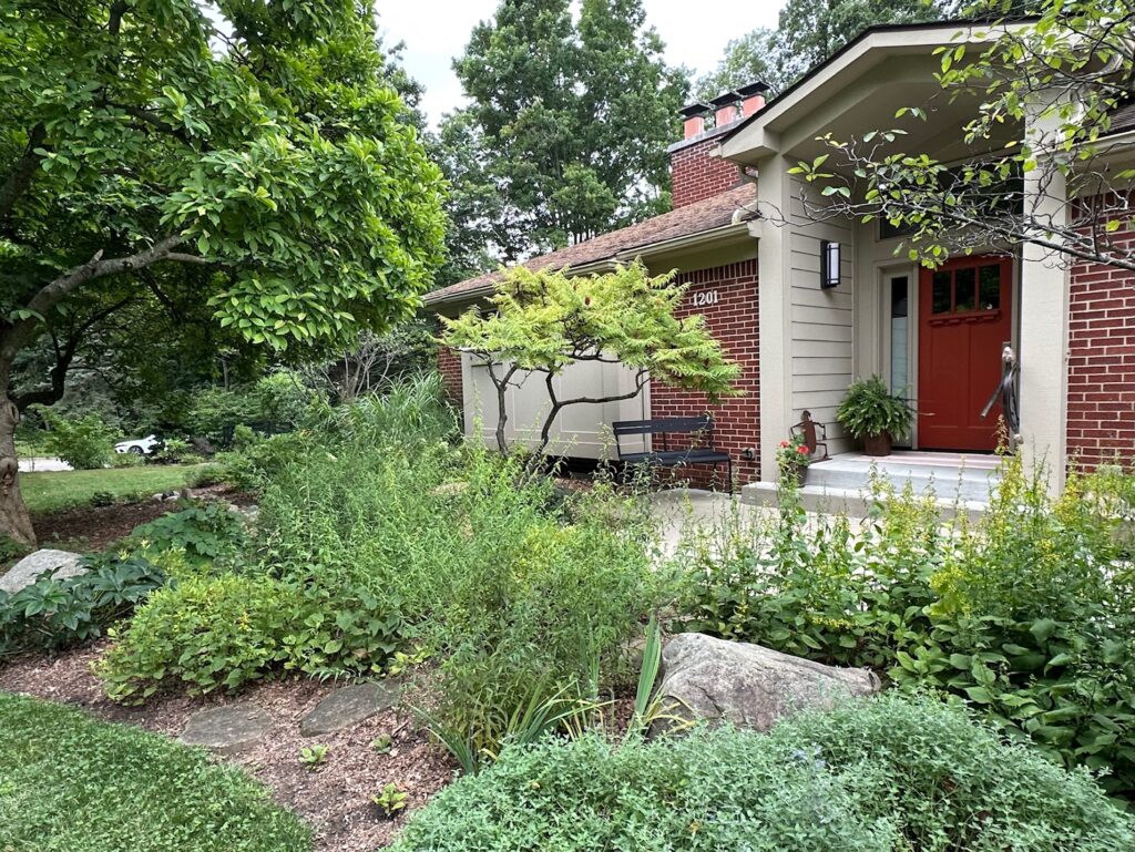 SEPTEMBER / Susan Margoshes yard – Susan is a native of southwest lower Michigan and moved to Virginia after graduation from University of Michigan in 1979. She moved to Ann Arbor in late 2023 and bought her home on Felch Street in February 2024. She has been re-learning the growing seasons and ecology of Michigan over the past year. Following a season of removing pachysandra, vinca, and assorted other invasive plantings from the small wooded yard, she completed a Master Rain Gardener class this past spring and then worked with Matt Demon to finalize a plant list for her rain garden as well as a small front yard native garden and two small woodland gardens in the backyard. You will find a mostly shaded yard with a generally thriving population of young native plants. Susan has plans for moving some plants around this fall including some non-native ferns and some hostas which were in the yard when she purchased the property. She welcomes opinions and ideas for moving forward with her small native gardens.